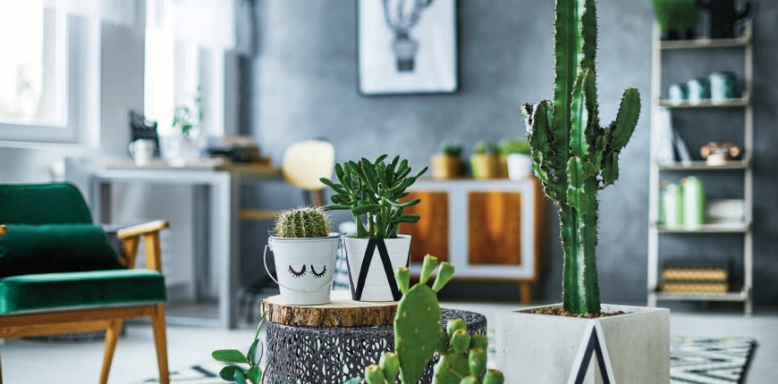 Niektóre odmiany dzięki kolcom mogą przypominać nawet kosmaty pompon jak np. Oreocereus. Przy odpowiedniej pielęgnacji kaktusy te odwdzięczą się nam dodatkowo niezwykle efektownym kwitnieniem – drobniutkimi tworzącymi wianuszek kwiatkami jak u Mamilarii czy ogromnymi przypominającymi anielskie trąby u Gymnokalicji. Bardzo atrakcyjny efekt mogą zapewnić odpowiednio wyeksponowane kaktusy o budowie kolumnowej, tworzące rozgałęzienia i rozrastające się intensywniej niż ich wspomniani kuliści krewniacy. Chociaż najciekawiej prezentują się pojedynczo wyeksponowane egzemplarze, to z ich wykorzystaniem możemy także zaproponować modną ekspozycję. Odmiany kaktusów kolumnowych jak np. Cereusy (popularnie zwane pałczakami) w  tym szczególnie popularny peruwiański, opuncja figowa, Myrtillocactus ze względu na rozgałęzioną budowę będą wymagały nieco większej przestrzeni i  najlepiej odsłoniętej płaszczyzny, by odpowiednio je wyeksponować. Kaktusy wyglądają najbardziej efektownie w zestawieniach o prostym surowym charakterze. Dlatego ładnie prezentują się w zwykłych ceramicznych doniczkach, w astetycznych betonowych pojemnikach lub w przeźroczystym szkle. Kaktusy są wdzięczne również w kompozycjach, które imitują ogrody skalne. Wyglądają efektownie sadzone w grupach w towarzystwie innych sukulentów.