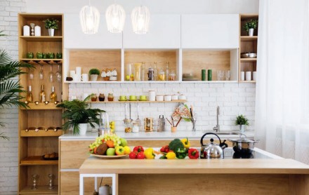 Kuchenny warsztat pracy spełni swoją funkcję, jeśli zadbamy o jego oświetlenie. Najlepiej tak, by blat użytkowy doświetlało światło naturalne. Pamiętajmy też, by nie tonął w zmroku wieczorem. Ważne jest jego równomierne doświetlenie światłem sztucznym. Dobry efekt da zamontowanie lamp pod szafkami wiszącymi lub w specjalnie wyciętych otworach w dole szafek. Odległość pomiędzy punktowymi źródłami światła powinna być jednakowa i wynosić od 40 do 60 cm. Do takiego rodzaju oświetlenia blatu wykorzystajmy LED-y, które nie nagrzewają się podczas długotrwałego przyrządzania posiłków. Równomiernie rozproszone światło dadzą także diody LED umieszczone na samoprzylepnych taśmach. Jeśli zależy nam, by światło nad strefą roboczą miało większy zasięg, zamontujmy lampy nad górnymi szafkami lub na suficie. W tej roli sprawdzą się wszelkiego rodzaju spoty, czyli lampy punktowe. Aby dobrze oświetlały blat, należy je rozplanować co 60-70 cm. Blat doświetla się także światłem wydobywającym się zza sufitu podwieszanego, który przybiera np. formę ramy. Do najciekawszych funkcjonalnie i dekoracyjnie należy oświetlenie przestrzeni roboczej na kuchennej wyspie, np. zamontowane w okapie. Gdy wyspa służy wyłącznie do przyrządzania potraw, lampy planuje się na suficie. Zwróćmy uwagę na barwę źródeł światła – odpowiednie będzie ciepłe o temperaturze barwowej 2800- -3000 K oraz Ra powyżej 80 – im bliżej 100, tym światło jest cieplejsze i bardziej zbliżone do światła dziennego. W takim świetle potrawy wyglądają apetycznie.